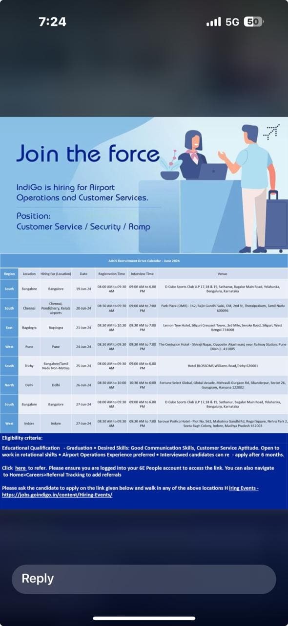 • Indigo interview will be conducted on 04.09.2024 (Wednesday) at Trichy station